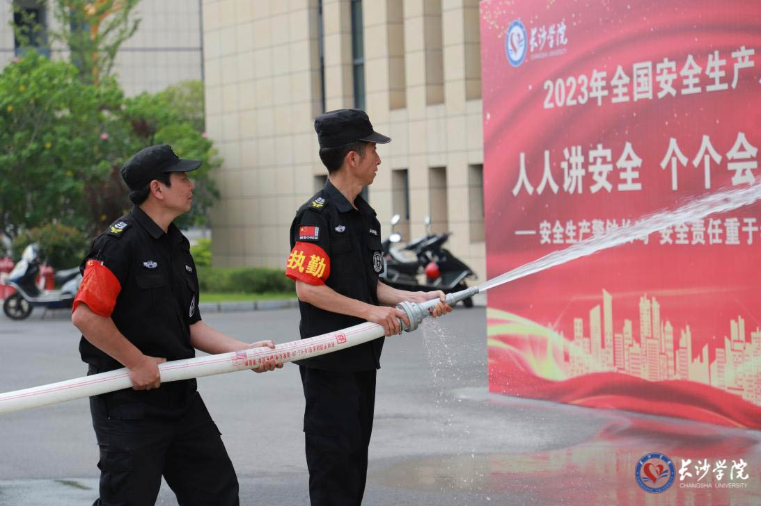 学校保卫处工作人员进行消防水带实操演练