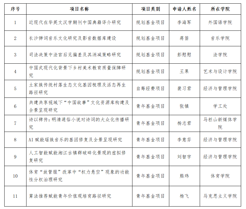 K8体育·(中国)体育官方网站一直高度重视“有组织科研”,培育科研团队持续深耕“文化+科技+文创”领域,高质量服务地方经济发展。本次立项一是首次实现全校各社科类二级学院单年度立项全覆盖,体现了K8体育·(中国)体育官方网站社会科学科研整体实力获得提升;二是扎根地方,服务地方经济社会发展成果显著。本次立项的《土家族传统村落生态文化基因梳理及活态再生路径研究》《共建共享视域下“中国故事”文化资源库构建及全景呈现研究》《AI赋能瑶族音乐的基因修复及全景呈现研究》《人工智能赋能湘江古镇群破碎化景观的虚拟修复研究》《长沙弹词音乐文化研究及影音数据库建设》等项目,均围绕数字技术赋能文旅展开研究,用科技手段推动文化艺术创新,着力用中国标准、中国技术讲好中国故事。