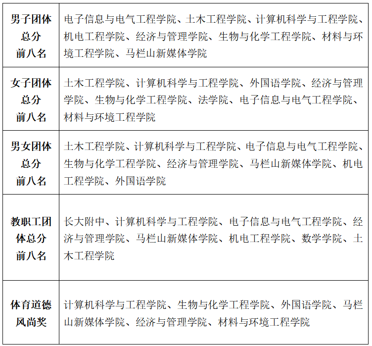 本次运动会设29个竞赛项目,共计2500余名师生参赛。经过两天有序紧张的赛事比拼,电子信息与电气工程学院、土木工程学院分获男子团体、女子团体第一名,土木工程学院获得团体总分第一名,长大附中教职工代表队以103分获得教职工团体总分第一名。计算机科学与工程学院、生物与化学工程学院等6个学院,以及112名运动员、110名裁判员获评“体育道德风尚奖”。在全校师生的奋勇拼搏下,本届运动会破赛会纪录2项,创纪录4项。