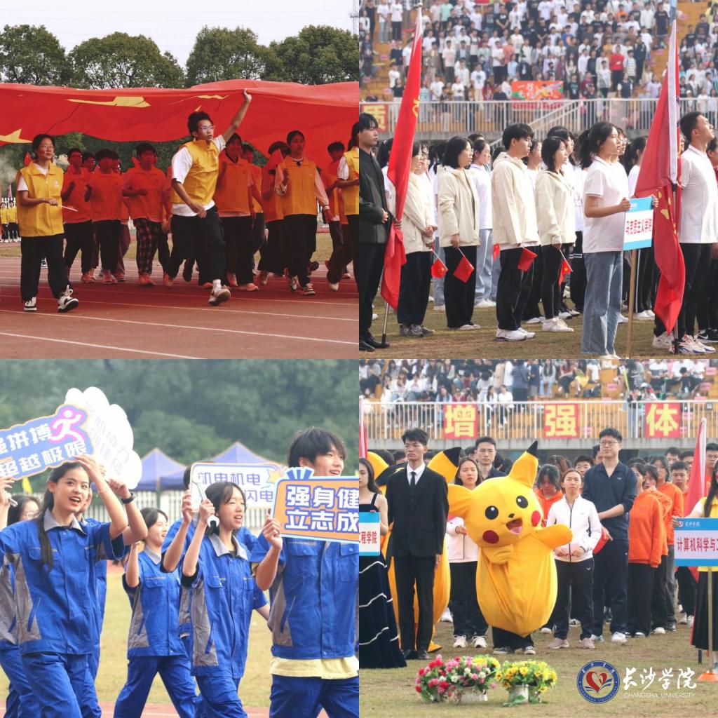 体育场内,双龙盘旋,无人机翱翔,在学校舞龙队和夜鹰无人机协会的精彩开场表演后,裁判员代表和16支师生代表队在国旗护卫队的引领下,步伐矫健,意气风发,踏着整齐划一的步伐进入体育场。计算机科学与工程学院代表队入场时,奔跑的青年高举着五星红旗自方阵上方飞扬而过,燃翻全场;经济与管理学院代表队放飞象征着梦想的彩色气球,仪式感满分;马栏山新媒体学院代表队高举学院特色专业海报,入场独具一格……各代表队无一不展现着长大师生自信昂扬的精神面貌。