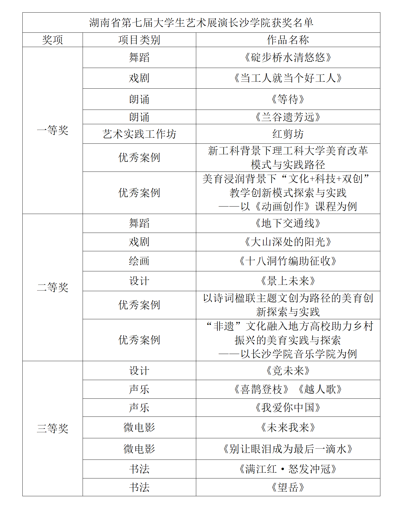 据悉,作为全省大学生的艺术盛会,湖南省大学生艺术展演活动每三年举办一次,是我省规格最高、规模最大、影响最广的大学生普及性艺术实践活动。学校以此次展演活动为契机,广泛发动师生,挖掘孵化、遴选培育优秀作品,营造出良好校园文化氛围。