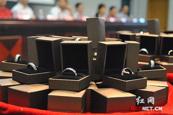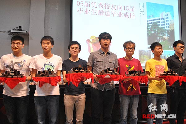 毕业生代表上台领取毕业戒指。