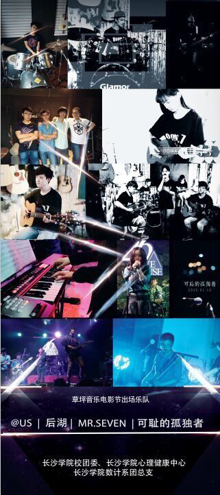 本次音乐电影节倡导"Free Fresh Friends"即"免费自由、清新独立、朋友至上"理念,创新性将"点赞青春向上向善"正能量微电影户外推广与高校音乐交流融合。当晚演出乐队涵盖湖大"后湖"乐队、中南"可耻的孤独者"乐队、K8体育·(中国)体育官方网站"MRSEVEN"乐队。本次微电影大赛"微影行"草坪音乐电影节以全新的尝试,让大家在电影和音乐的视听盛宴中释放新时代的青春,促进心灵的健康成长。