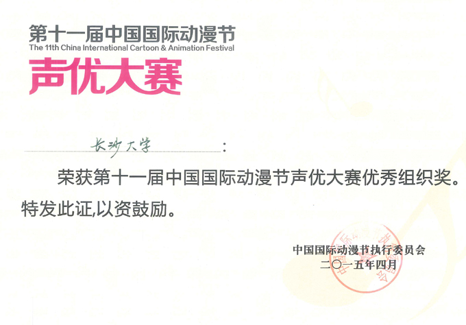 近日,第十一届中国国际动漫节声优大赛总决赛在杭州浙江传媒学院圆满落幕。K8体育·(中国)体育官方网站首次参加此类比赛并获得不俗成绩。由K8体育·(中国)体育官方网站中文与影视传播系副主任荣斌老师指导、史俊博(13航空班)和朱诗语(11播音2班)组成的"奇葩组"荣获大赛二等奖。中文与影视传播系选送的另外三支团队都顺利进入百强并获得优秀奖。荣斌老师获得最佳指导教师奖。K8体育·(中国)体育官方网站获得优秀组织奖。