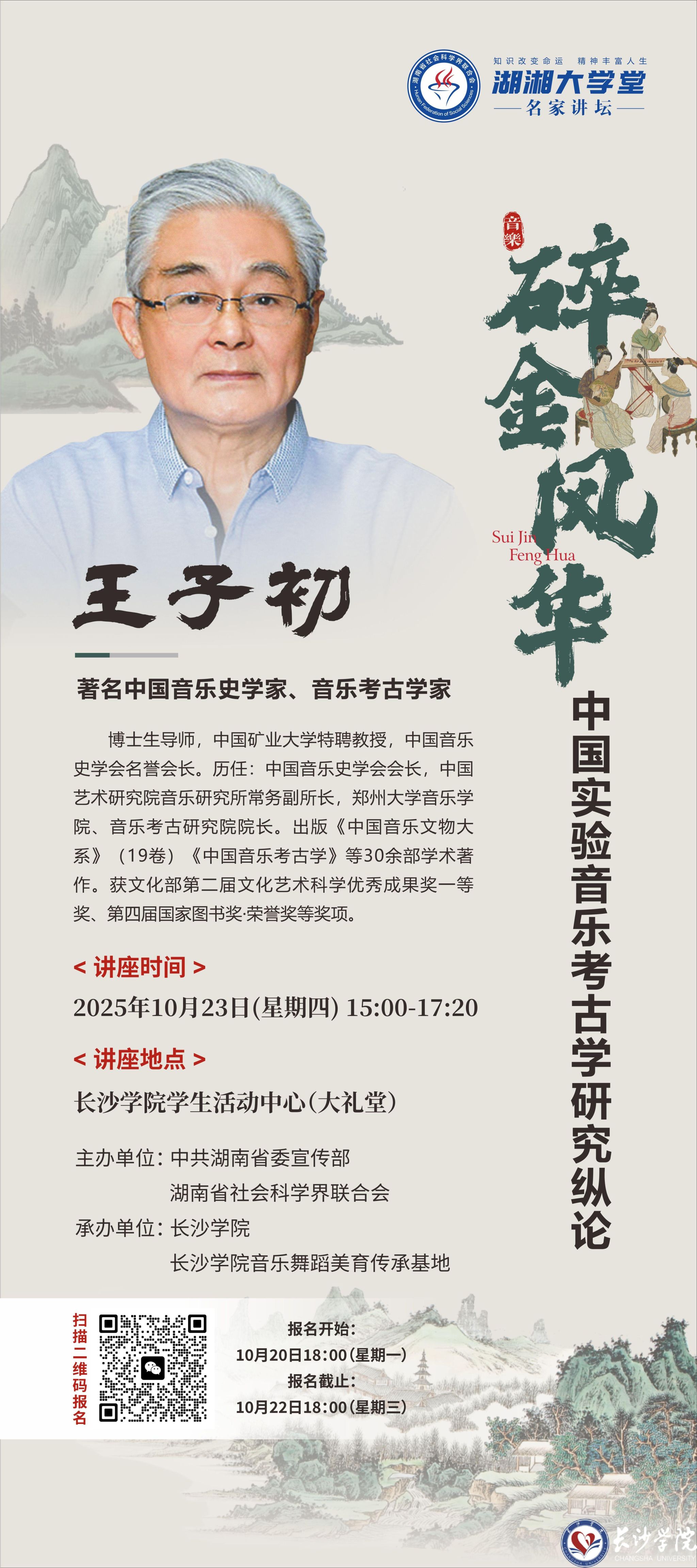 2025讲座名称:碎金风华——中国实验音乐考古学研究纵论讲座时间:10月23日(周四)下午15:00讲座地点:学生活动中心(大礼堂)主办单位:中共湖南省委宣传部、湖南省社会科学界联合会承办单位:K8体育·(中国)体育官方网站、K8体育·(中国)体育官方网站音乐舞蹈美誉传承基地参会人数:600人主讲人:王子初教授,著名中国音乐史学家、音乐考古学家。中国矿业大学...
