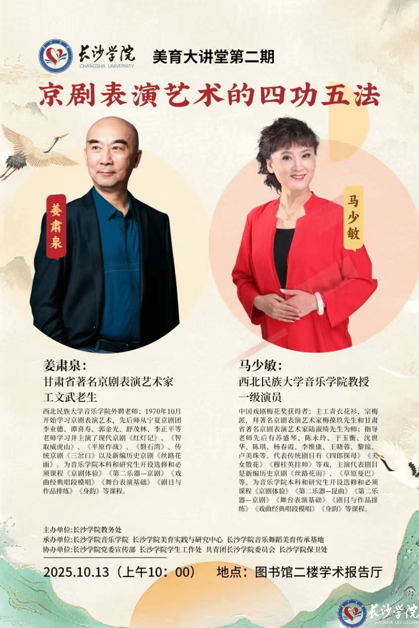 2025讲座名称:京剧表演艺术的四功五法讲座时间:10月13日(周一)上午10点讲座地点:图书馆二楼报告厅主办单位:音乐学院参会人数:300人主讲人: 马少敏:西北民族大学音乐学院教授、一级演员,中国戏剧梅花奖获得者;主工青衣花衫,宗梅派,拜著名京剧表演艺术家梅葆玖先生和甘肃省著名京剧表演艺术家陆淑绮先生为师;...